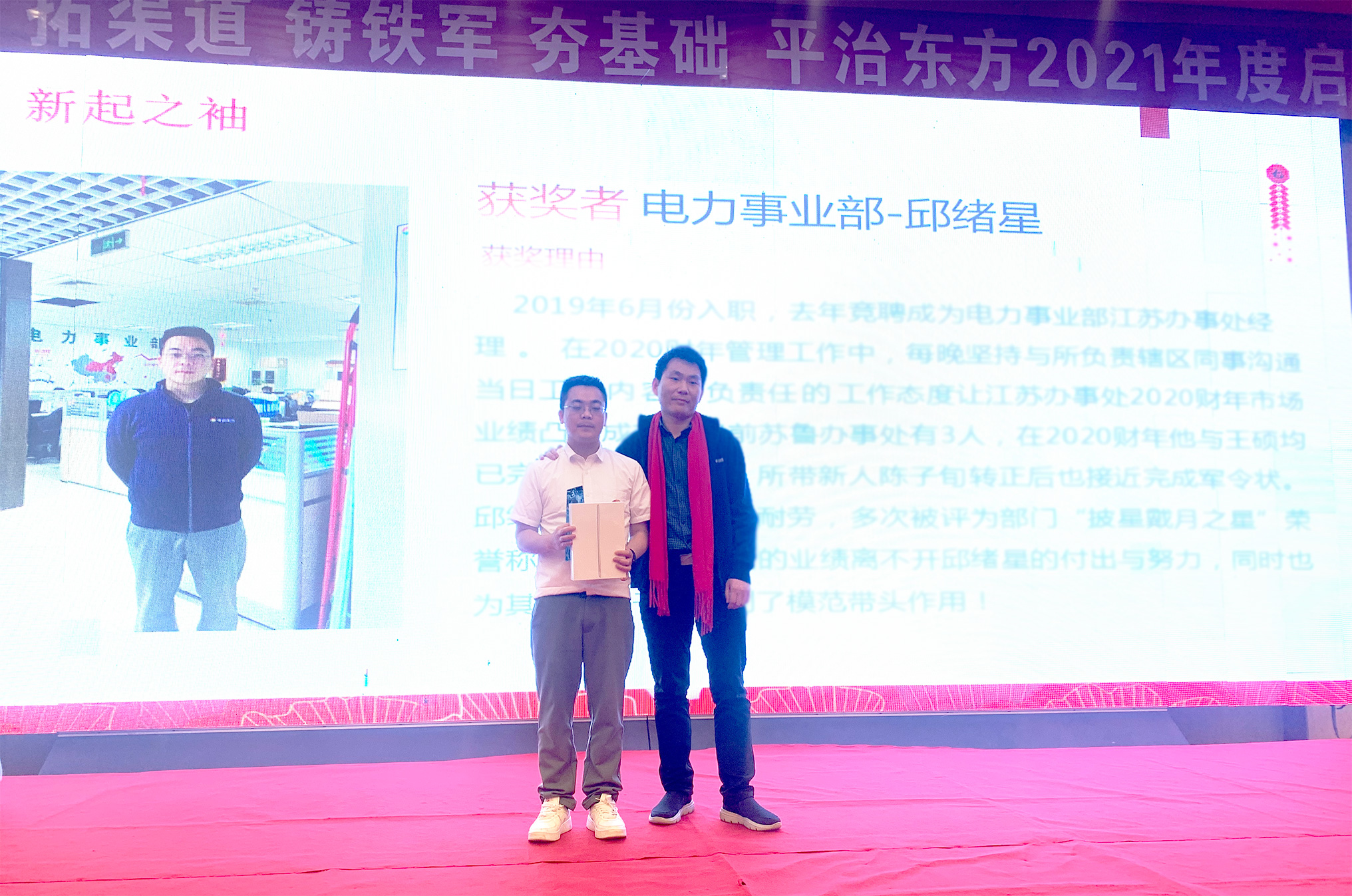 2020年平治东方于全体直销团队开展了平治铁军年度五虎上将PK赛活动,经过一年的激烈PK,电力销售团队赵鹏、张磊,济南销售团队王强,电力销售团队邱绪星、赵克和分别获得年度麒麟将、青龙将、白虎将、朱雀将、玄武将称号,电力销售团队人均回款额排名第一,范总分别为他们颁发荣誉奖杯、锦旗及奖金。